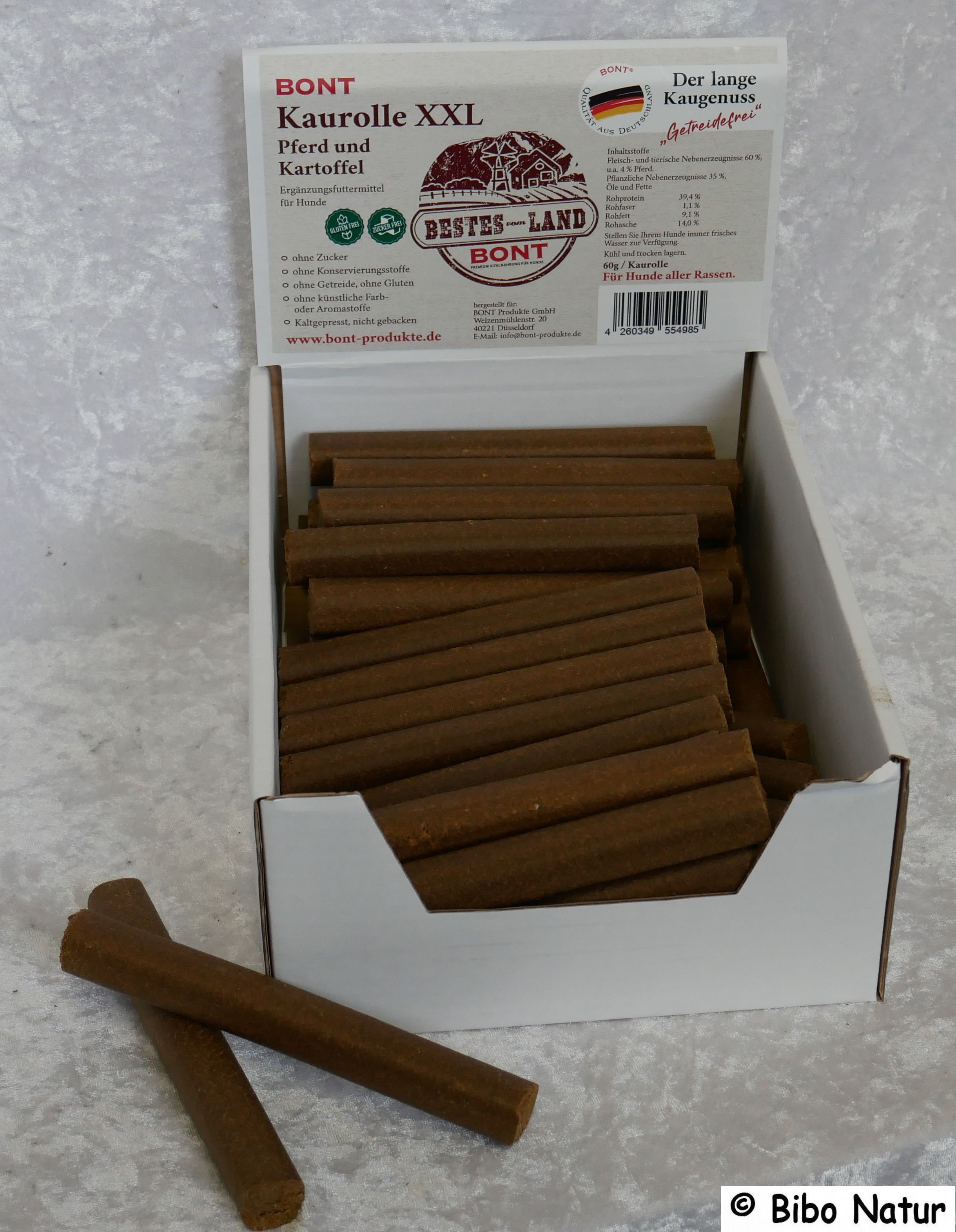 Die Rollen in der Geschmacksrichtung Pferd und Kartoffel sind eine willkommene Abwechslung und Belohnung auf dem Speiseplan. Sie sind ca. 15 cm lang und haben einen Durchmesser von 2 cm. Durch die kaltgepresste und nicht gebacken Herstellung kann man diese leicht in kleinere Stücke brechen.