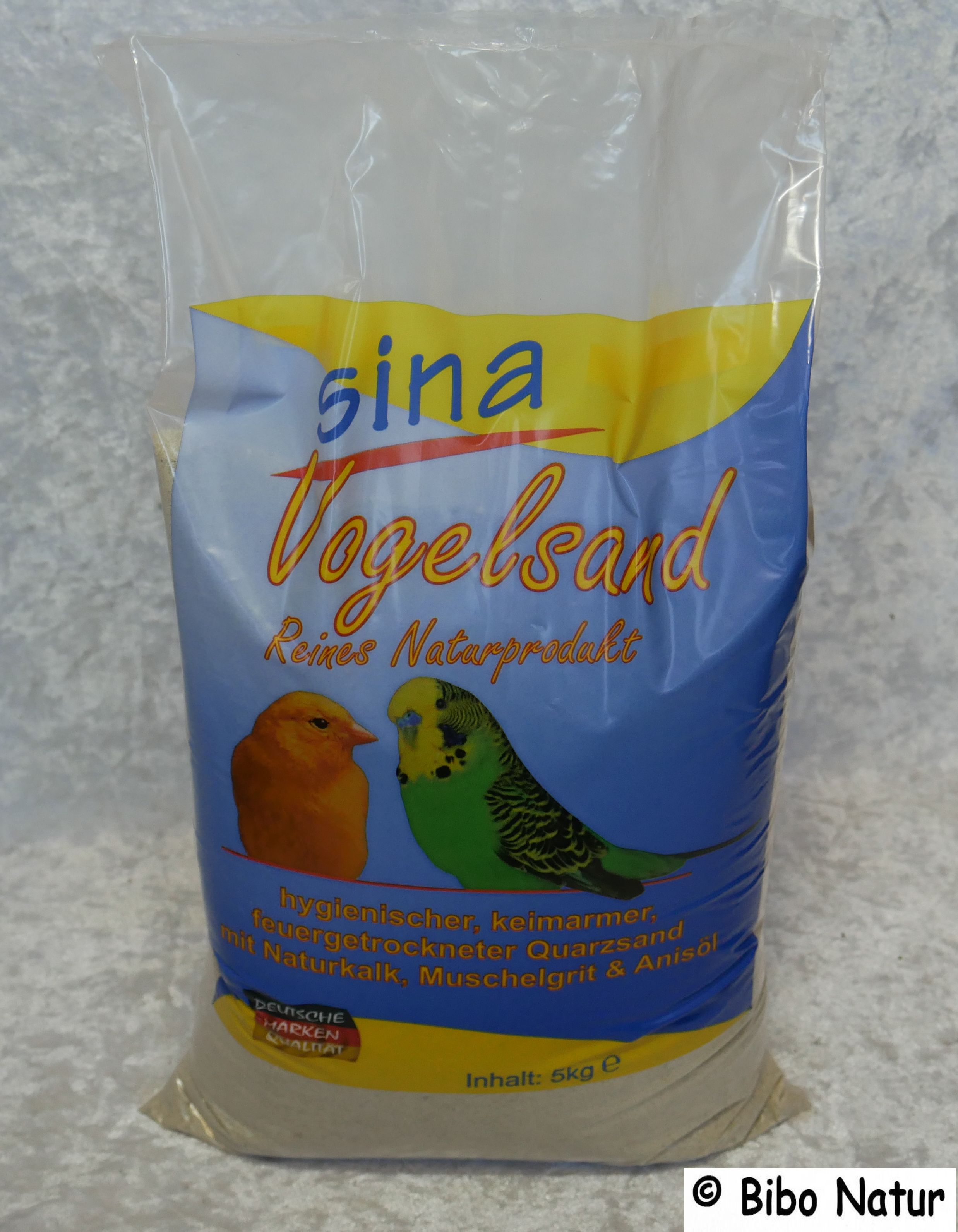 Sina-Vogelsand ist ein Gescheraner Qualitätsprodukt und keimfrei. Gleichzeitig enthält es Muschelgrit, Naturkalk und Anisöl.